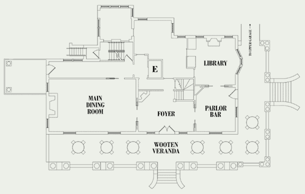 Adorned with crystal chandeliers and custom designed plush carpet, the exquisite Main Dining Room is the largest space in the Goodall Wooten House. This room also features one of the original marble fireplaces, which is the only working fireplace in the house.