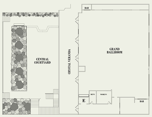 Directly outside the Grand Ballroom, the expansive Crystal Veranda features wrought iron columns and railing. The grand staircase flows directly from the veranda into the Central Courtyard.